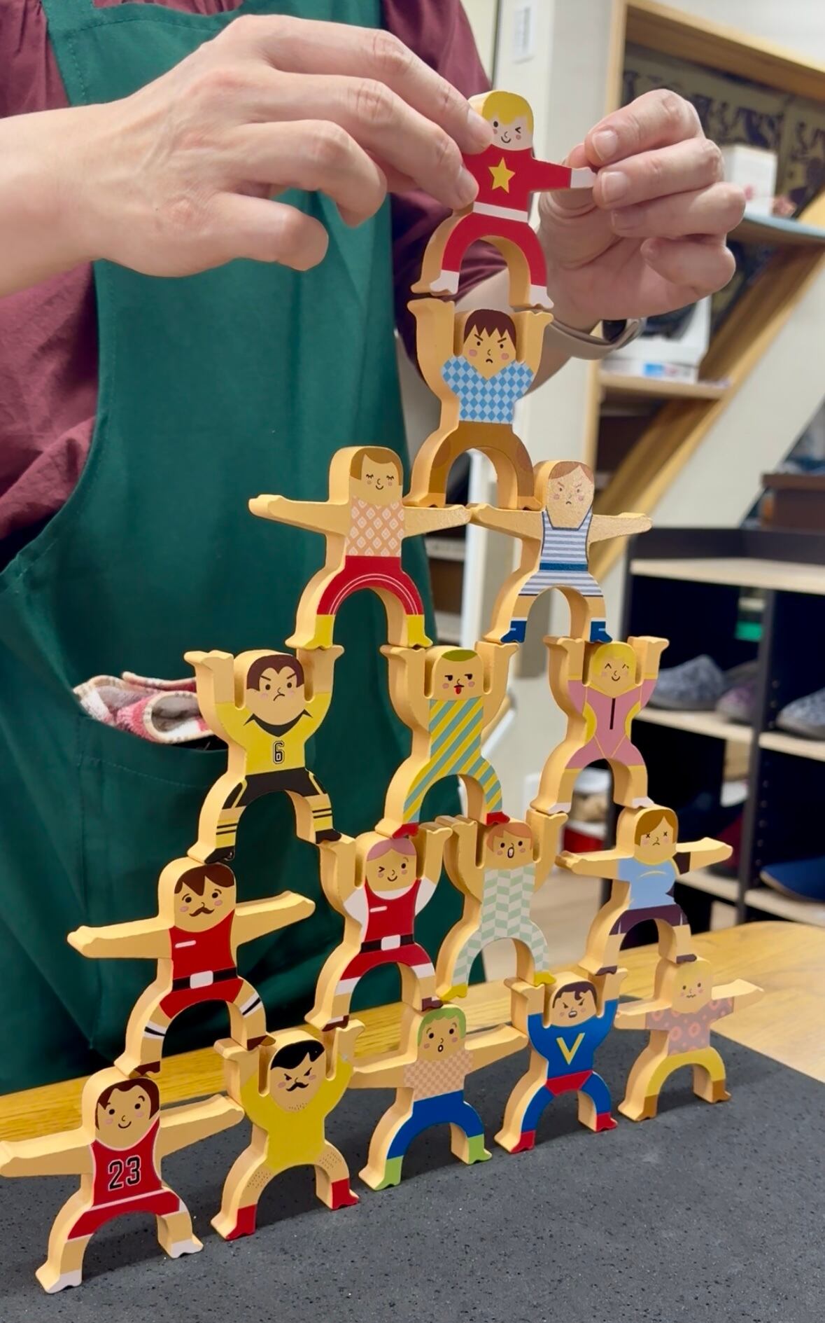 手をつないだり肩に乗せたり、バランスを考えながら高く積み上げれば、まるでお祭りのような楽しさが広がります。